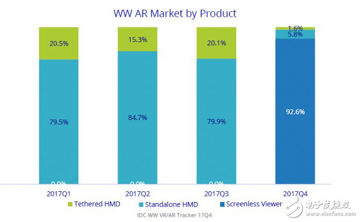 2017年年底上市的联想AR头显Mirage在2017年Q4季度达到45万的销量,使得无屏AR设备占据2017年AR头显全年销量的75%。