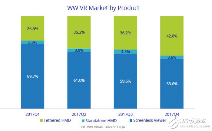 根据报告2017年系留VR设备的市场份额不断扩大,并连续四个季度压榨无屏VR设备的市场空间,而一体机VR设备则一直维持一个比较稳定的市场空间。