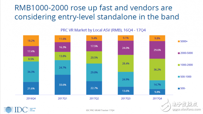 在价格上,得益于一体机的发展,中国VR市场也给出了明确的反应。其中,1000~2000元的市场增长最快,其次是2000~5000元的市场。相反,500元以下的产品则越来越缺少市场空间,500~1000元的市场空间也呈现走低趋势。